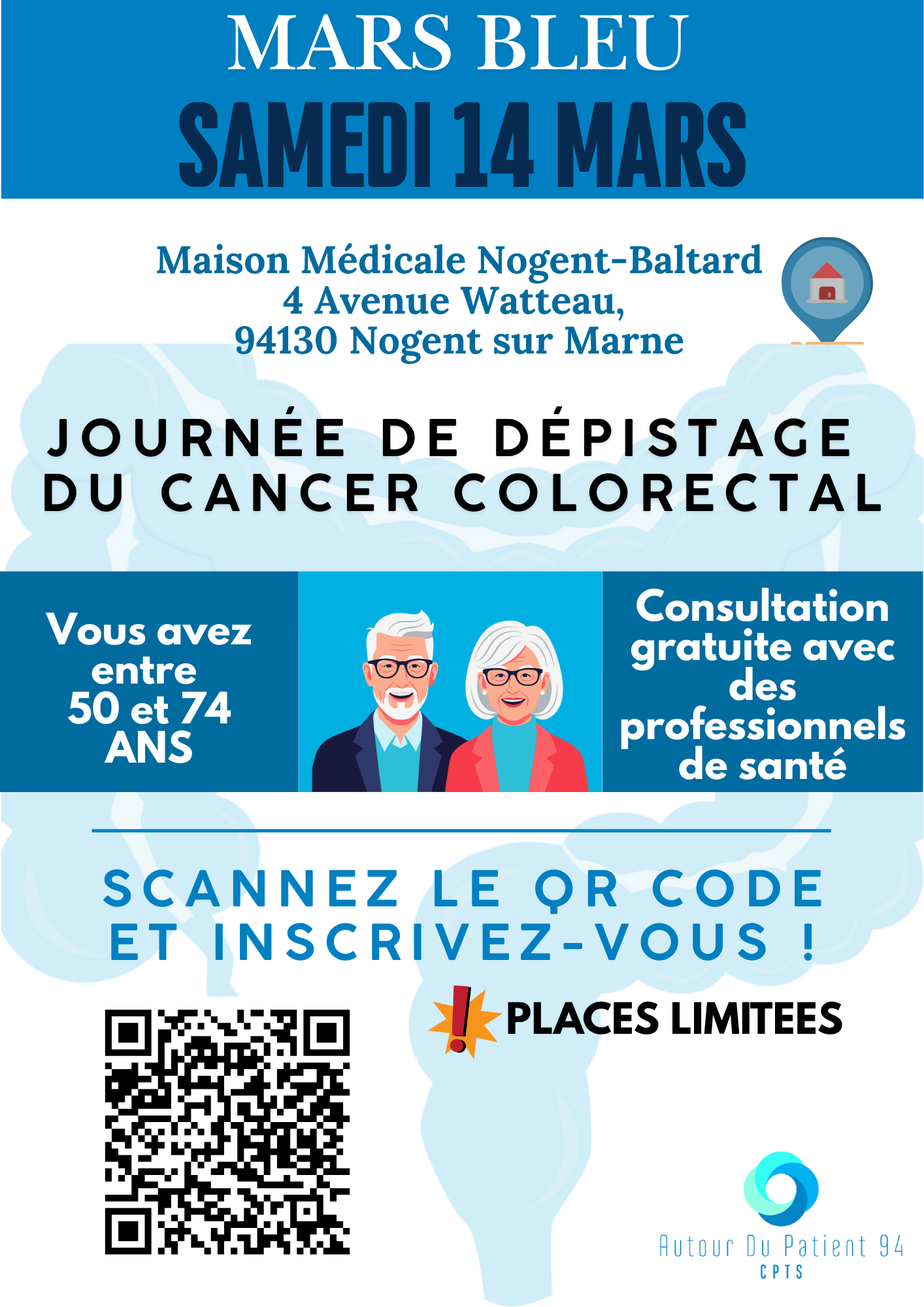 La CPTS Autour du Patient 94 a le plaisir de de vous proposer un parcours ayant pour objectif de vous permettre de mieux comprendre le dépistage du cancer colorectal, d’en connaître les différentes étapes et de poser vos questions directement aux professionnels de santé impliqués.